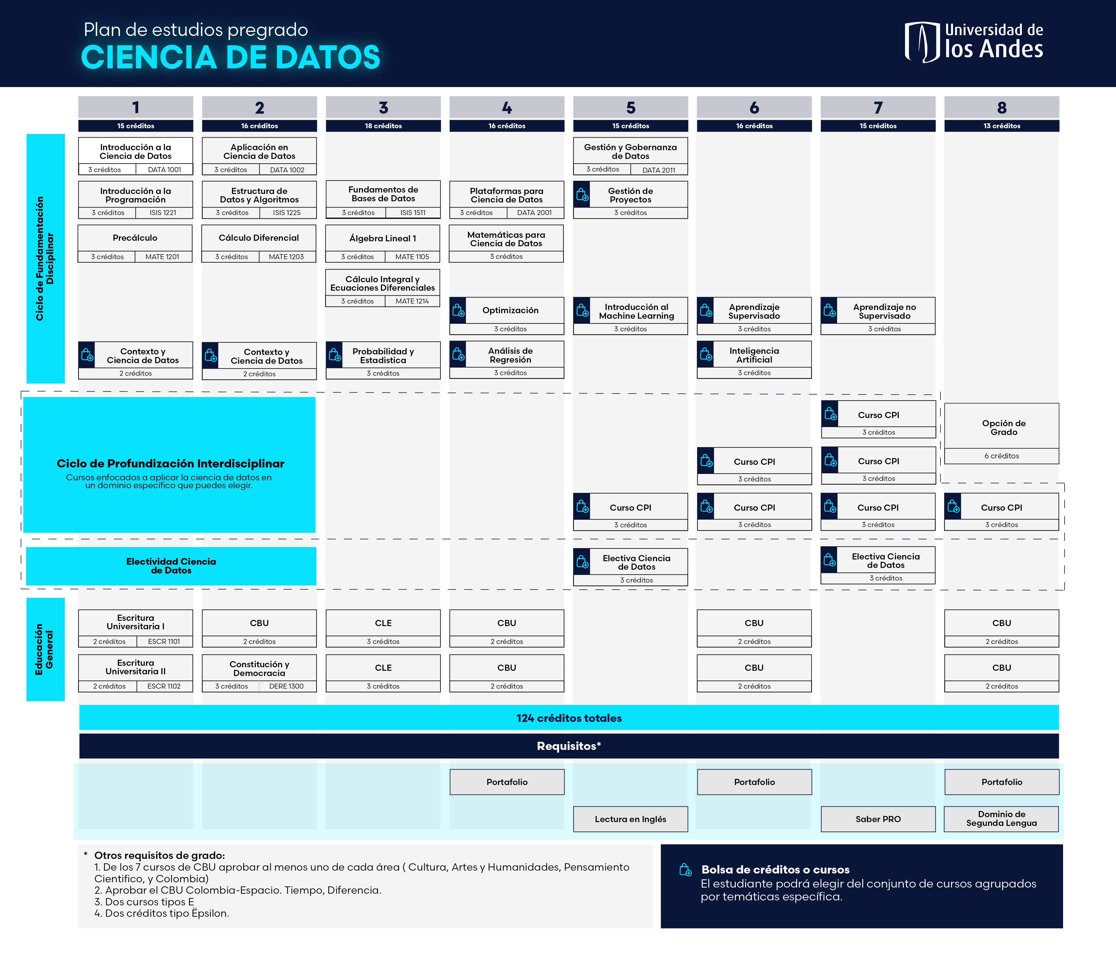 El pregrado en Ciencia de Datos de la Universidad de los Andes es una propuesta innovadora e interdisciplinaria que reúne la experiencia de las facultades de Ingeniería, Ciencias, Ciencias Sociales, Administración y Economía. Está diseñado para formar profesionales capaces de enfrentar desafíos complejos mediante el análisis y la interpretación de datos, combinando una base sólida en matemáticas, estadística, programación y modelación con la aplicación práctica en diversos contextos reales. A través de módulos interdisciplinarios y trabajo en equipo, los estudiantes desarrollan una visión crítica y colaborativa que les permite conectar herramientas de ciencia de datos con problemas del mundo real. Su enfoque flexible, su modalidad presencial y la posibilidad de articularse con otros programas de pregrado y posgrado permiten una formación integral, ética y con visión de futuro, respondiendo a las crecientes demandas del entorno laboral en Colombia y el mundo.